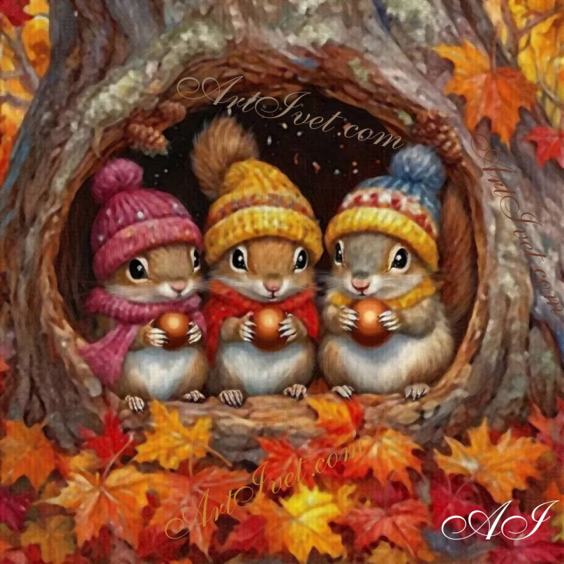 Pictura pe numere - Trei veverite cu ghinde 40х40 cm