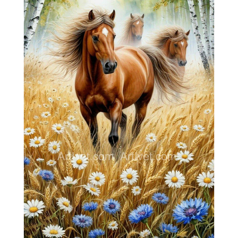 Pictura pe numere - Cai liberi printe flori si grau