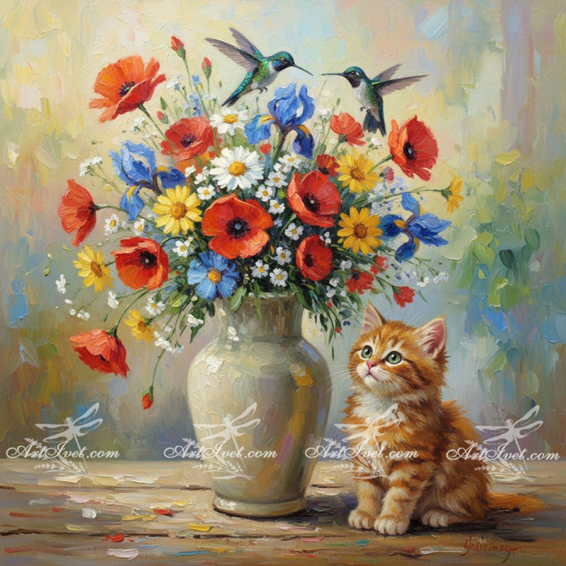 Pictura pe numere - Pisica priveste dansul colibriilor 40х40 сm