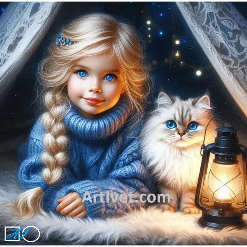 Goblen de diamante - Fetita si pisica - Prieteni cu ochi albastri