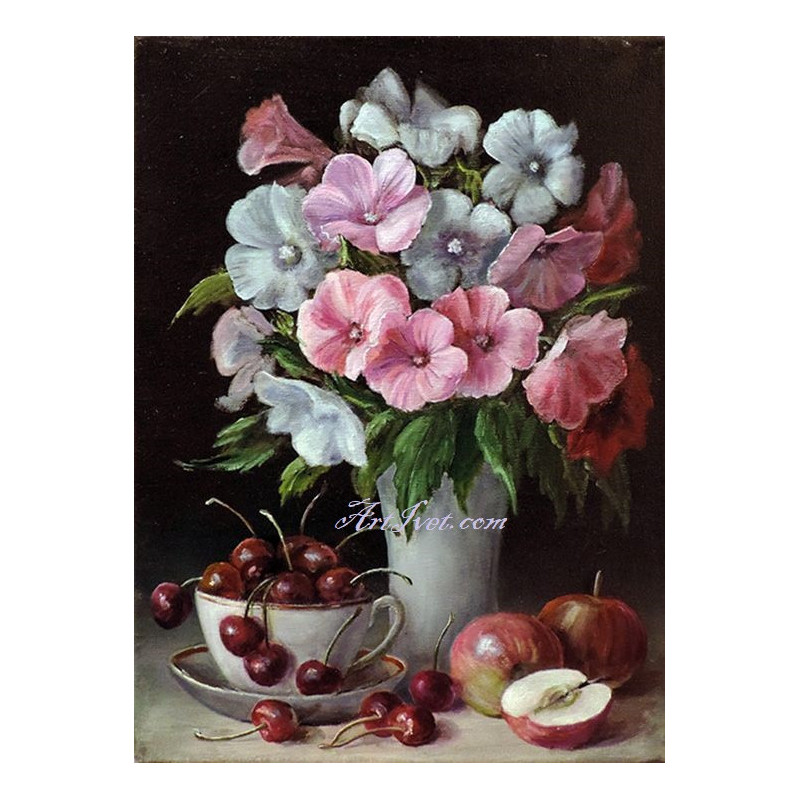 Pictura pe numere - Flori gingase in roz, cirese si mere