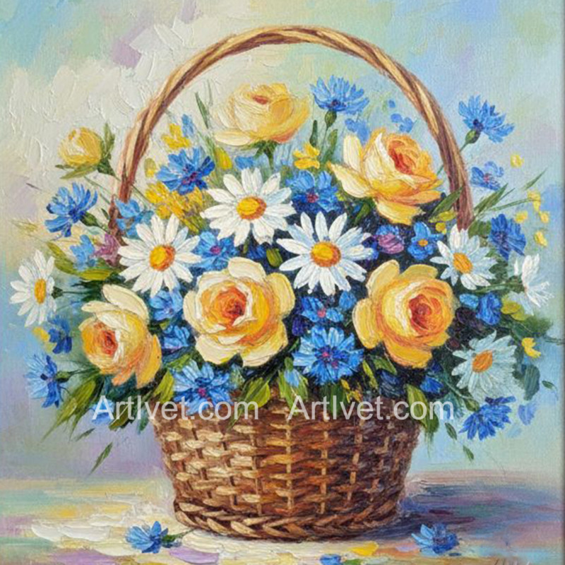 Pictura pe numere - Cos cu margarete, albastrele si trandafiri galbeni40х40 сm