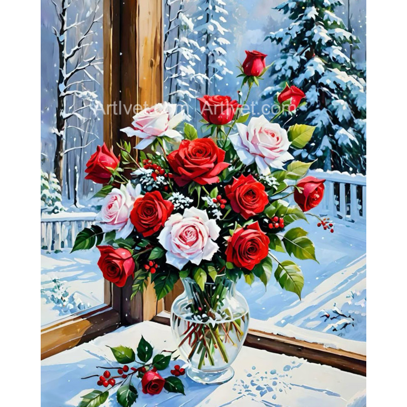 Pictura pe numere - Trandafiri la fereastra inghetata