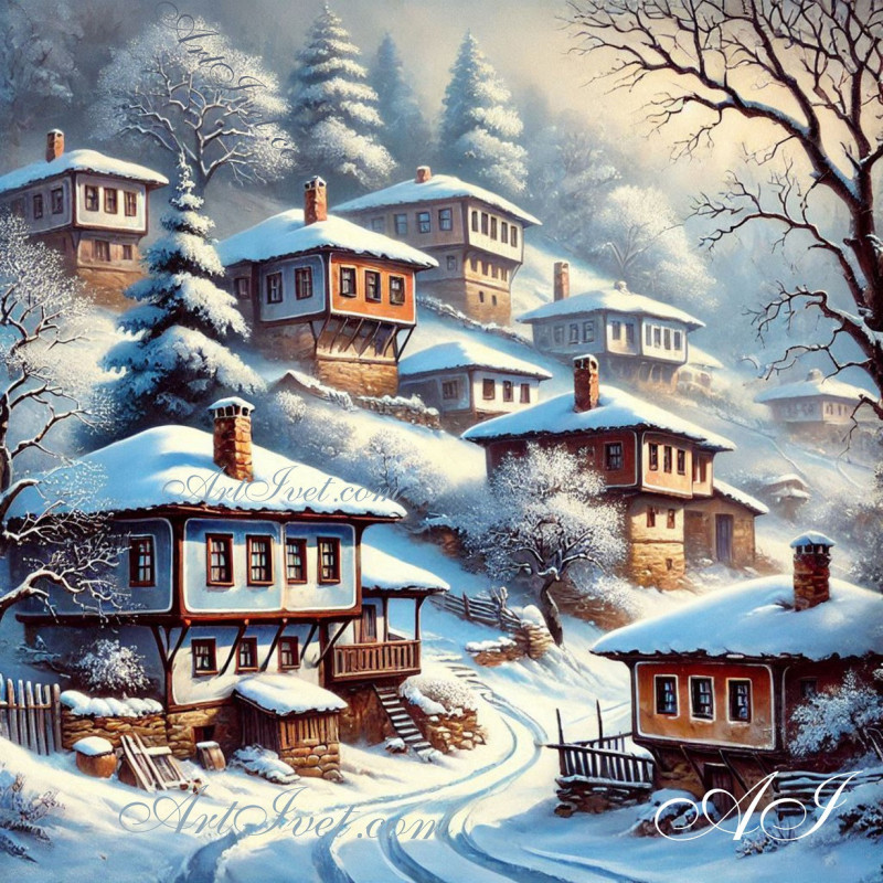 Pictura pe numere - Satucul sub plapuma iernii 40х40 сm