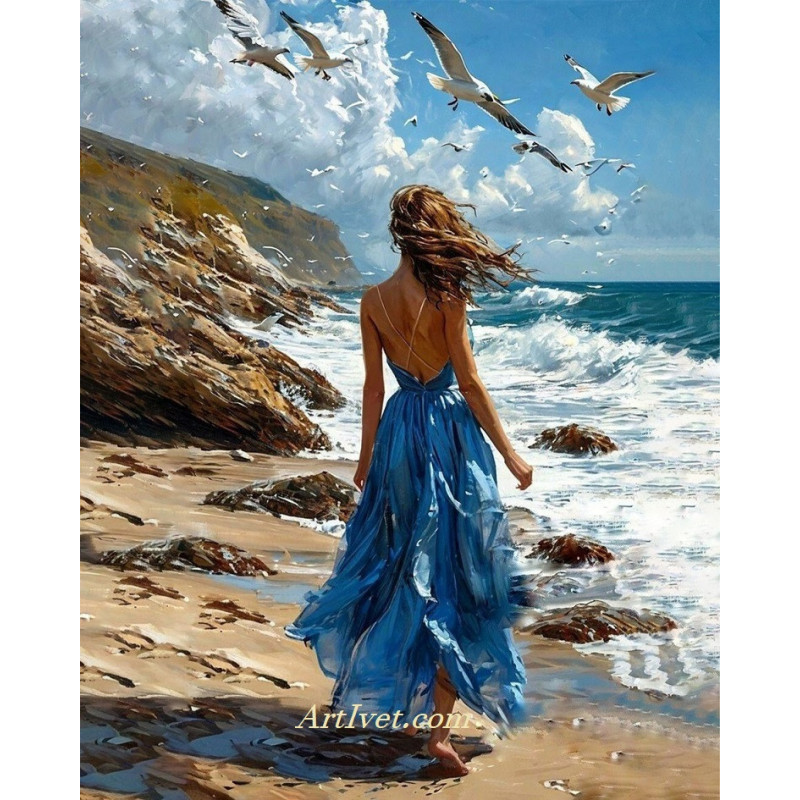 Pictura pe numere - Doamna in rochie albastra pe malul stancos