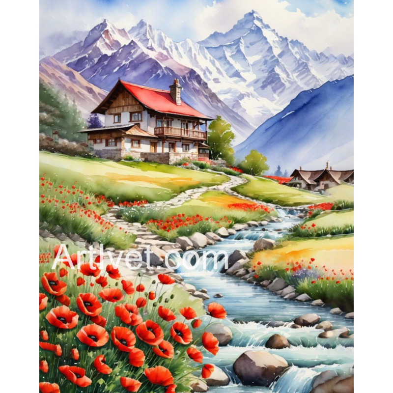 Pictura pe numere - Macii langa casa de pe coasta muntilor