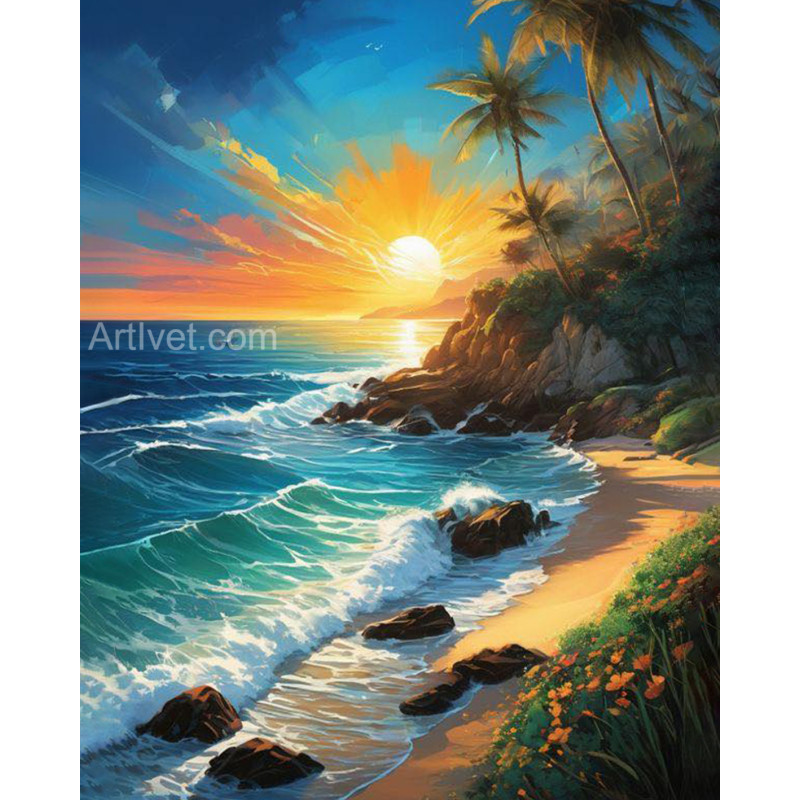 Pictura pe numere - Rasarit de soare peste valuri