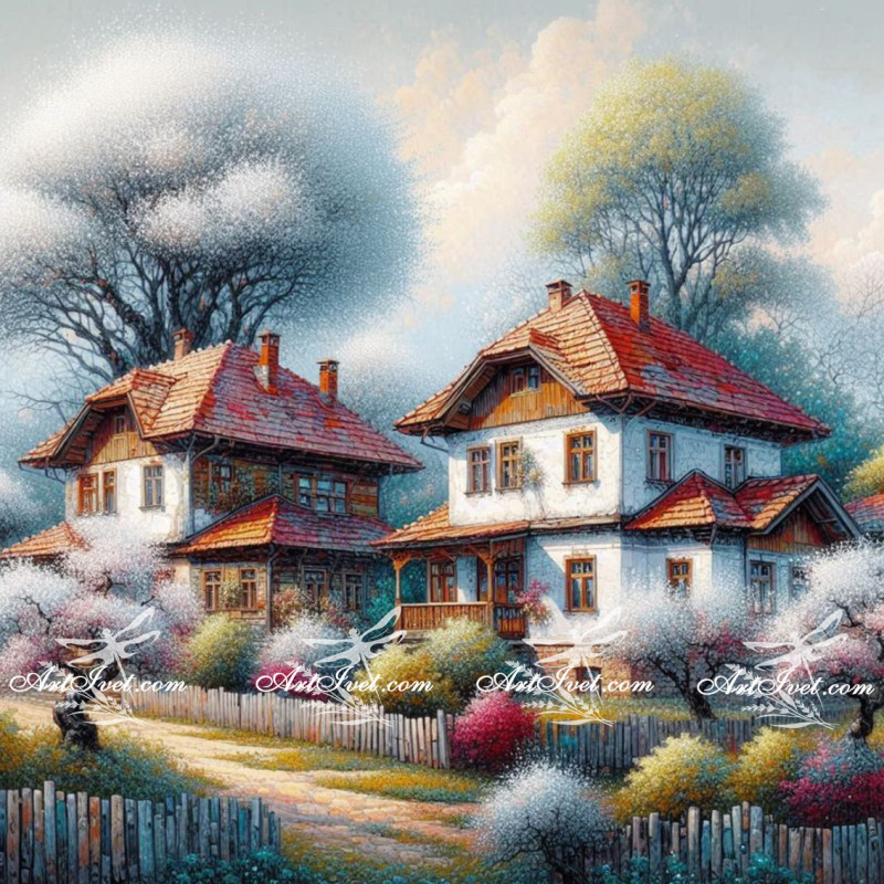Pictura pe numere - Case cu copaci ca bumbacul 40х40 сm