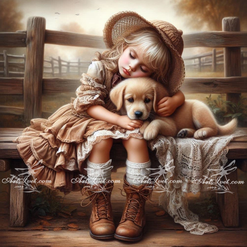 Pictura pe numere - Doar cinci minute de pauza - Fetita si catelul 40х40 сm