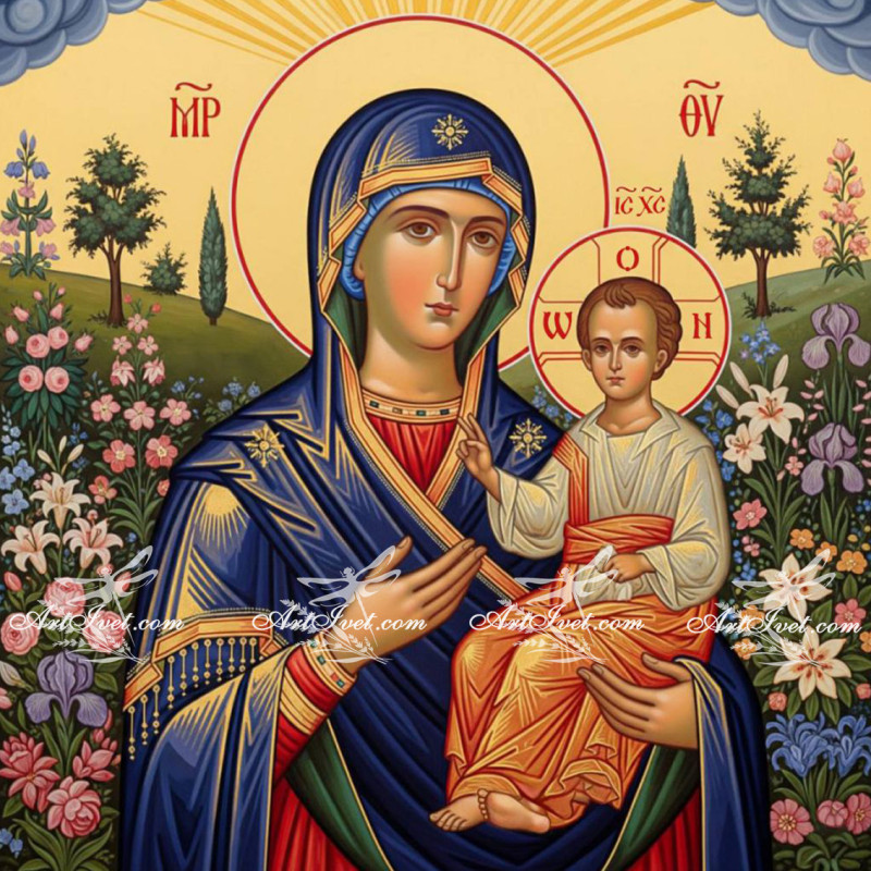 Pictura pe numere - Sfanta Fecioara cu Pruncul pe fundal colorat 40х40 сm