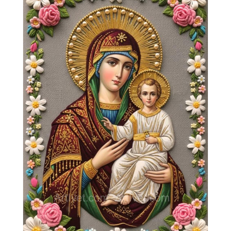 Pictura pe numere - Maica Domnului si pruncul - Flori sfinte